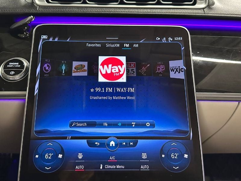 - Radio: MBUX w/Navigation -inc: 12.8" OLED touch screen, Hey Mercedes voice control, augmented video for navigation, wireless front charging, wireless smartphone integration (Apple CarPlay, Android Auto) and online music streaming